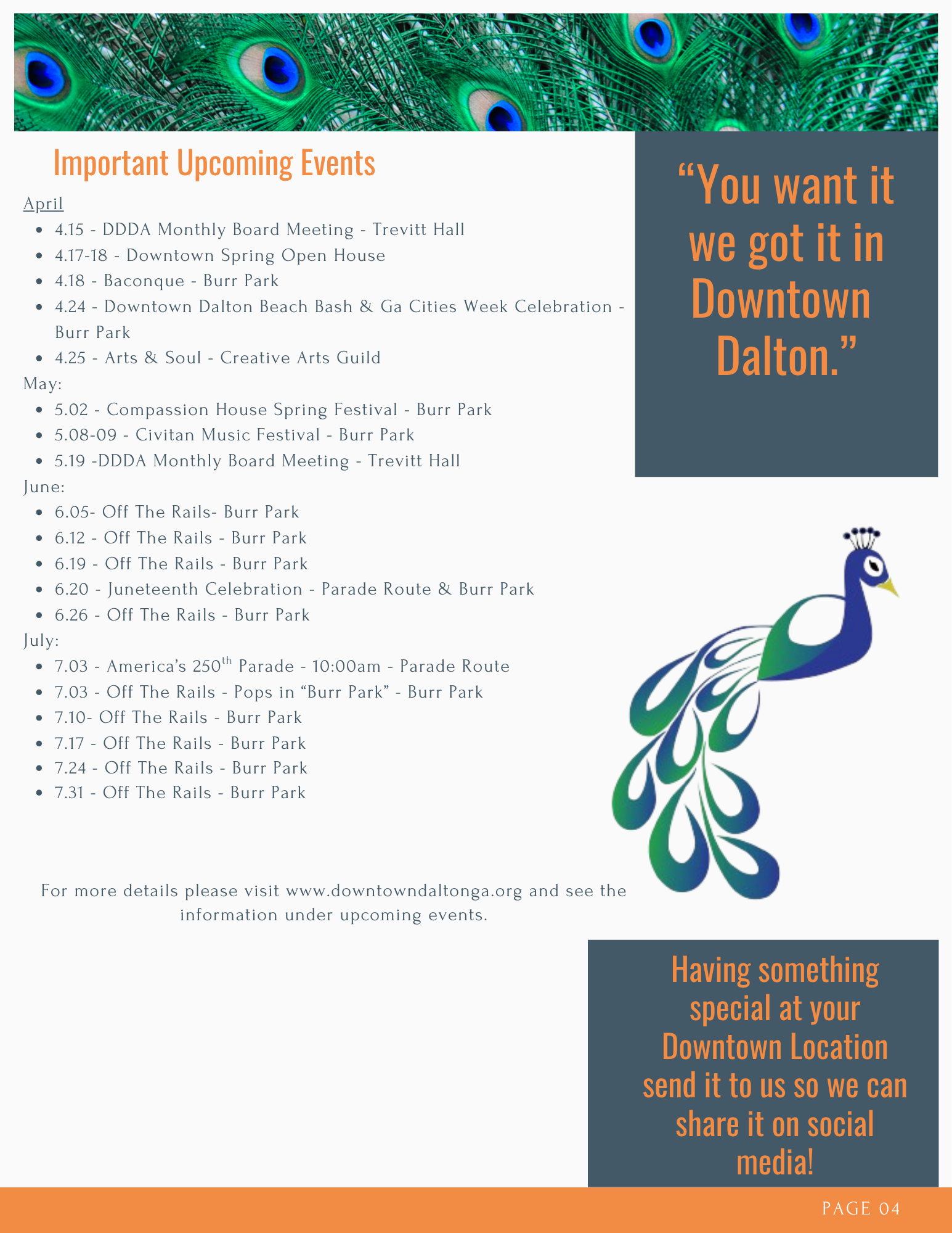 Welcome to Downtown Dalton - the heart and soul of the City of Dalton and Whitfield County, Georgia. This historic and picturesque downtown district has been a national Main Street City since 1985 and is managed by the Downtown Dalton Development Authority (DDDA). An eclectic and impressive array of one-of-a-kind shops and dining cuisine, attractions from the Civil War era, and the region’s leading professional businesses and financial institutions offer the perfect setting to play, learn, work, and live.