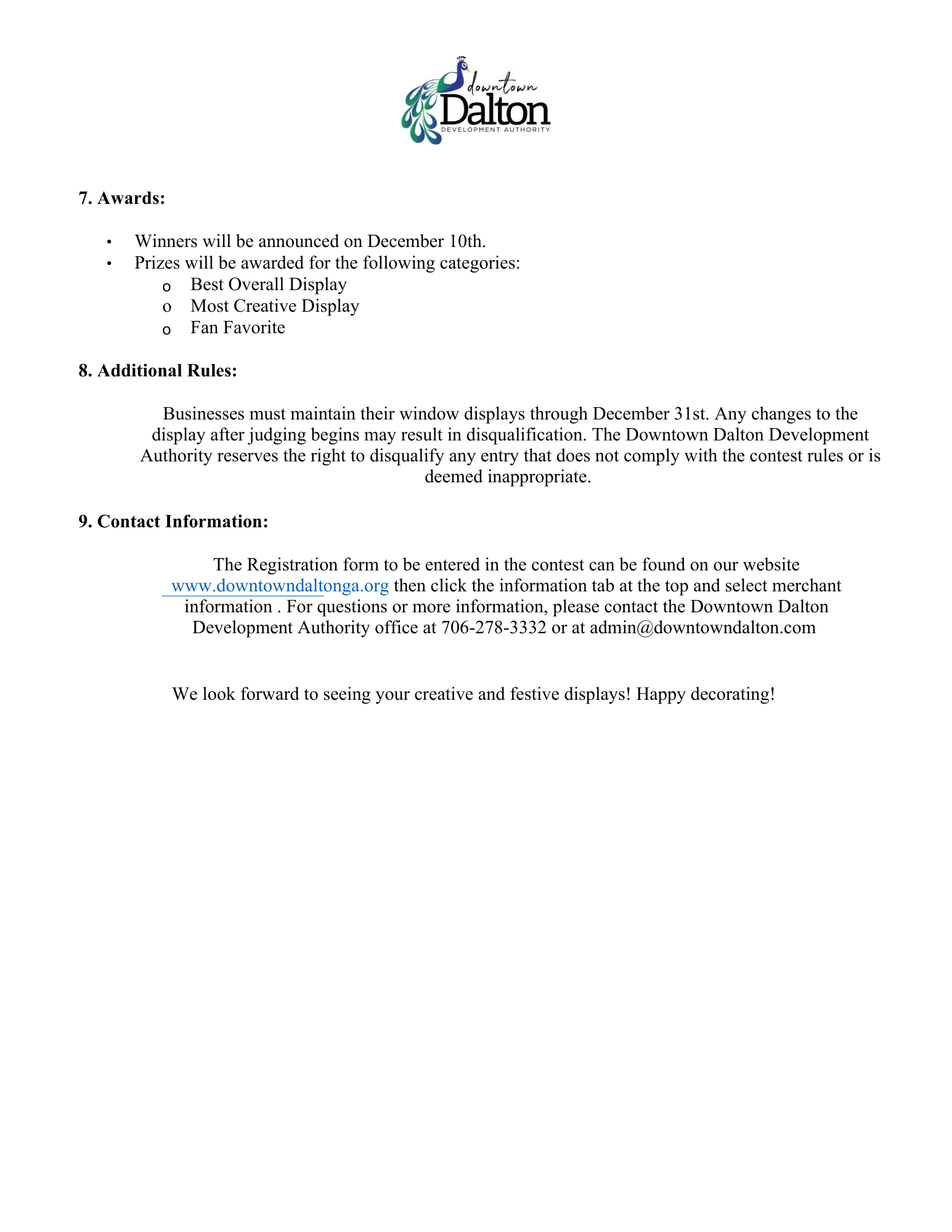 Please Fill Out the Form Below Buisness Name * Buisness Address * Contact Person * Contact Phone Number * (###) ### #### Contact Email * Theme of Window Display * Description of Project * Agreement: By signing below, I acknowledge that I have read and agree to abide by the contest rules as provided by the Downtown Dalton Development Authority. I understand that my window display must be completed by December 1st and will remain in place through December 31st. I also consent to the use of photos of my window display for promotional purposes by the Downtown Development Authority. * Thank you!